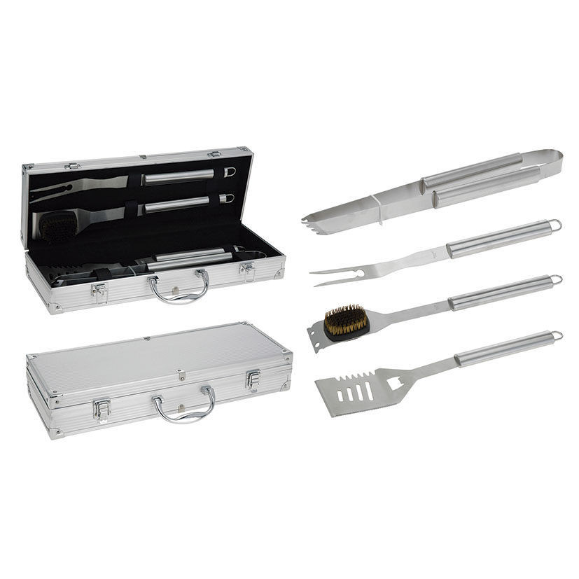 Este juego está compuesto por: unas pinzas, un trinchador de carne, una espátula y un práctico cepillo para limpiar la parrilla. El juego viene presentado en un cómodo maletín metálico.