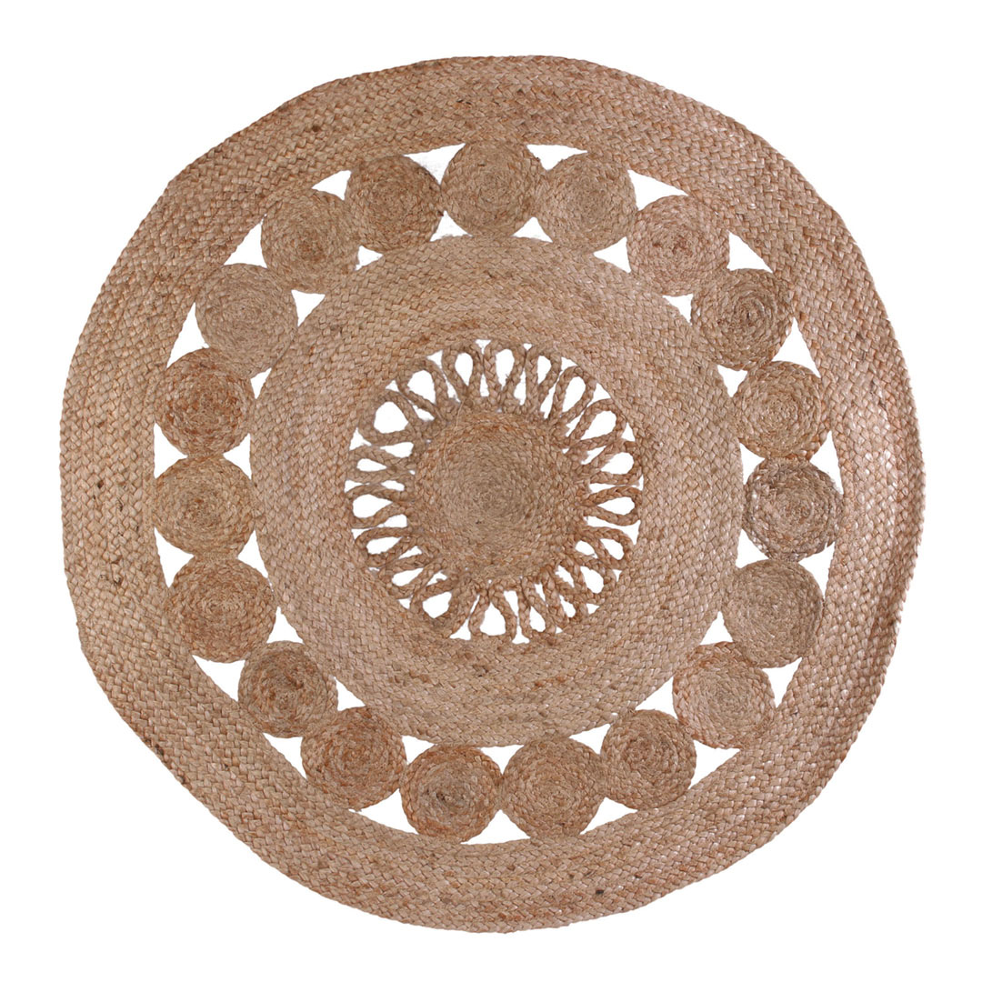 Esta alfombra está fabricada en yute y está calada. Se unirán fácilmente a tu decoración aportando calidez y diseño. Tiene un diámetro de 90 y una altura de 0,5 cm.