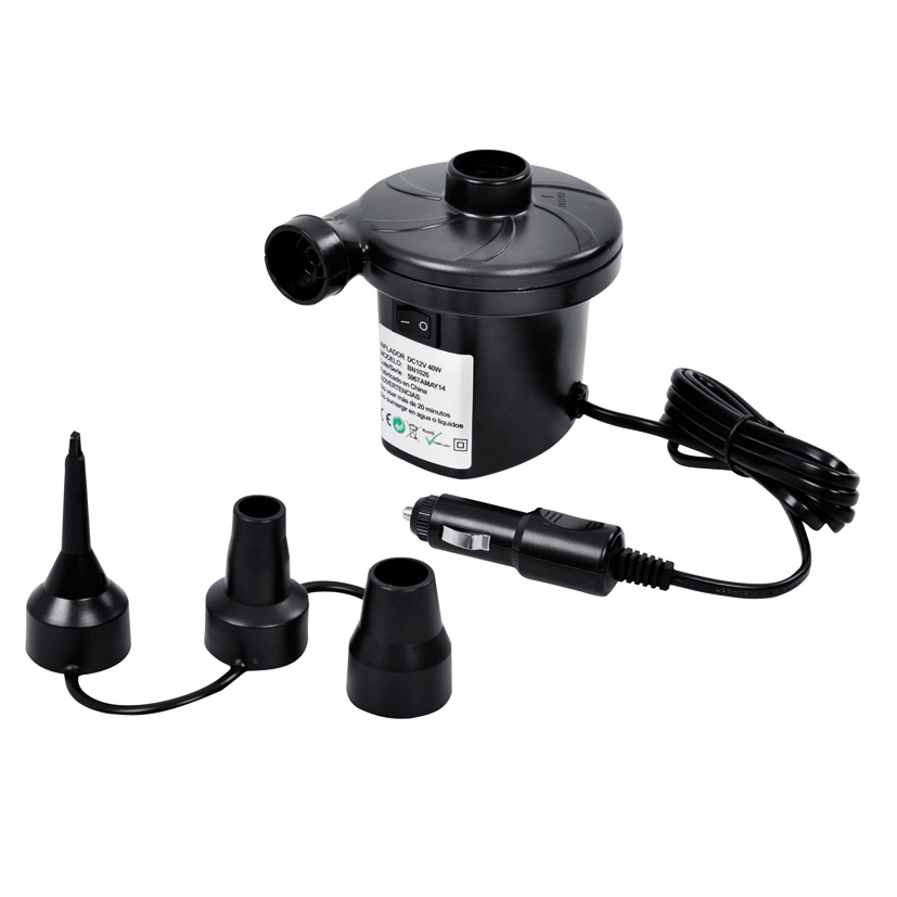Bomba aire eléctrica 12 V automóvilIncluye 3 válvulas adaptadoras. Este modelo posee una conexión de 12 V para automóvil.