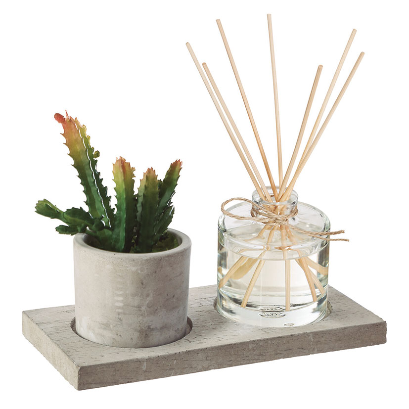 Esta caja es un motivo o idea para hacer un regalo. Se compone por un soporte o base de cemento que incluye una maceta con una planta tipo captus decorativa y un aceite perfumado con 8 bastoncillos tipo mikado que se impregnan del aroma del aceite perfumado.