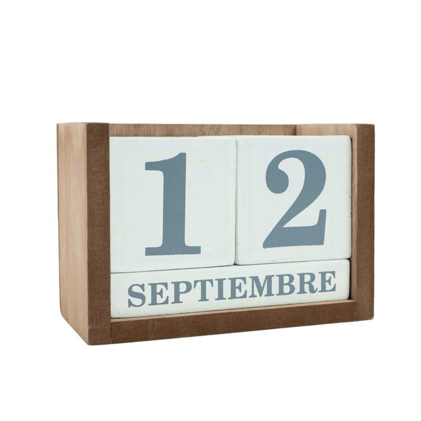 Calendario perpetuo decorativo de madera con cubos numéricos y meses intercambiables.