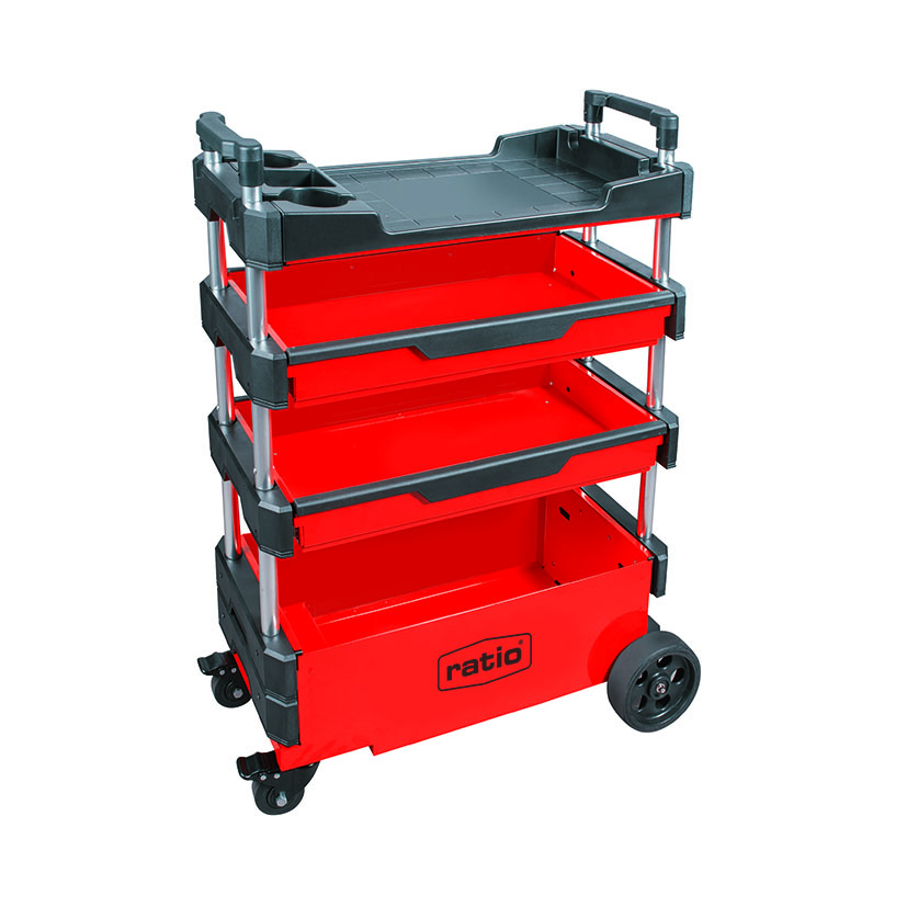 El carro RATIO 7705 es plegable y extensible, con estructura rígida en chapa que garantiza resistencia y estabilidad. Cuenta con 4 bandejas: 2 cajones de 56,5×28,5×h.6,5 cm y un compartimento inferior de 56,5×28×h.18,2 cm, ideales para almacenar y ordenar todo tipo de herramientas y accesorios. Su diseño extensible con guías abatibles facilita el transporte y optimiza el espacio, mientras que las ruedas (2 fijas de ø150 mm y 2 pivotantes con freno de ø70 mm) permiten moverlo con facilidad y seguridad. Soporta hasta 20 kg y mide 70×38×h.53,5 cm cerrado y 95 cm extendido, siendo práctico para tener siempre tus herramientas a mano.