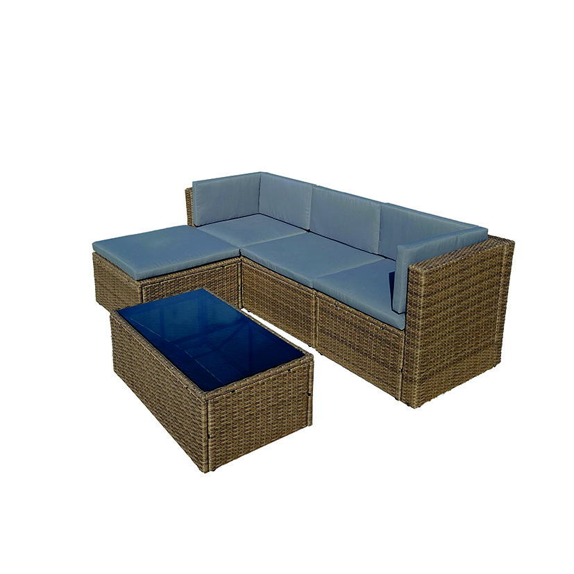 Este conjunto viene compuesto por una estructura metálica y tejido de ratán sintético plano, ideal y de gran resistencia a la intemperie. Es elegante y de gran comodidad para colocarlo en tu rincón favorito y poder hacer un lugar especial para disfrutar del tiempo libre. Este conjunto está compuesto por 1 sofá de tres plazas de dimensiones 195x65xh.66 cm, 1 chaise longue de 65x65xh.34 cm y 1 mesa 90x50xh.34 cm. Los cojines están fabricados en poliéster, material idóneo para exteriores. Viene presentado en caja. Atención, este conjunto no viene montado.