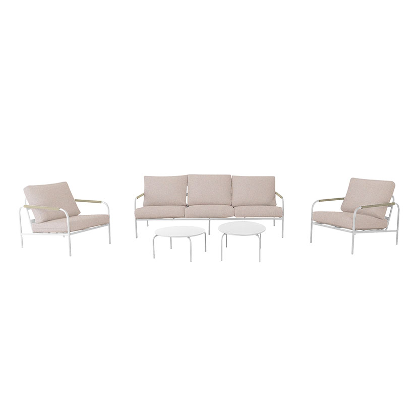 Este conjunto para jardín Oslo es una elección ideal para quienes buscan muebles funcionales con un diseño moderno y elegante. Esta fabricado por una estructura resistente fabricada en acero de 25 mm de diámetro con un acabado en color blanco que aporta frescura y modernidad. Reposabrazos adornados con cuerda color beige de 5 mm, que combina a la perfección con los cojines. Los cojines están elaborados en poliéster texturizado en color natural, diseñados para ofrecer comodidad y un toque sofisticado.