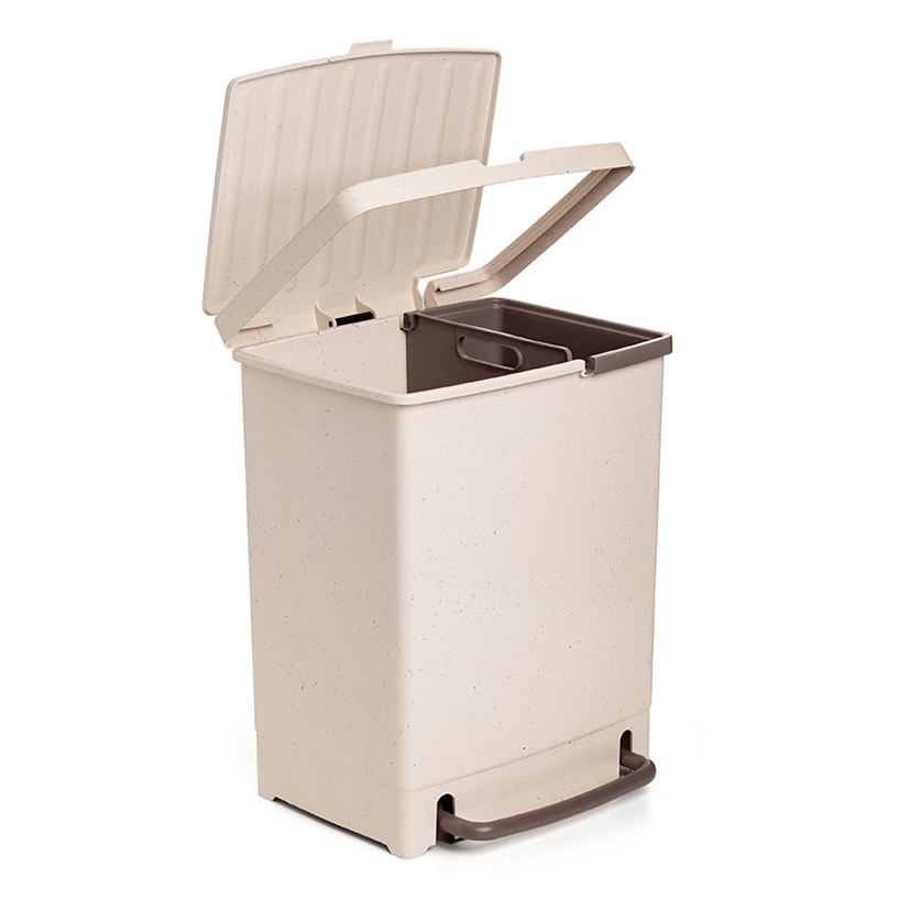 Este cubo está fabricado material 100% reciclado, tiene una capacidad de 17 litros más una cubeta interior de 8 litros que se extrae para una fácil limpieza. En la base incorpora un pedal que se acciona mediante el pie para abrir la tapa de una forma automática sin utilizar las manos. Viene presentado en caja.