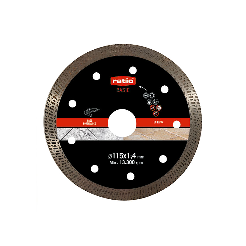 Altura del segmento 10 mm. Disco de corte de diamante profesional. Para cortes limpios y rectos en porcelánicos y gres. Brida reforzada Conforme a: EN 13236.