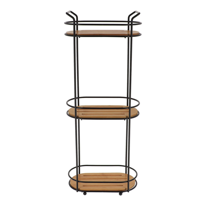 Estante de esquina con tres niveles, elaborado con una estructura metálica y baldas de bambú. Se presenta como un complemento ideal para tu hogar, adaptándose sin esfuerzo a variados ambientes y estilos decorativos. Puedes integrarla fácilmente con otros productos de la línea de bambú disponibles en nuestra tienda online.