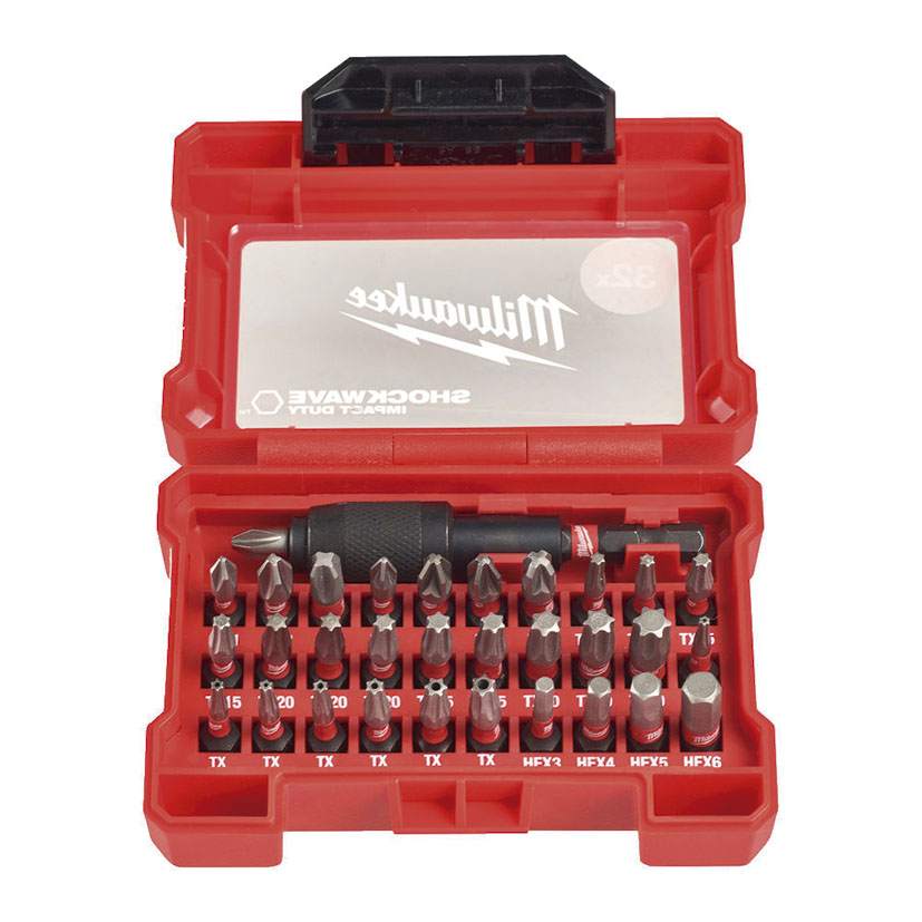 El estuche de 32 piezas MILWAUKEE SHOCKWAVE_x0099_ de 1/4″. Está copuesto por puntas de atornillado y portapuntas magnético fabricadas mediante una aleación de acero, fórmula especial, hace que las puntas sean más resistentes a los impactos. Además, gracias a su geometría, diseñada para ser flexible.