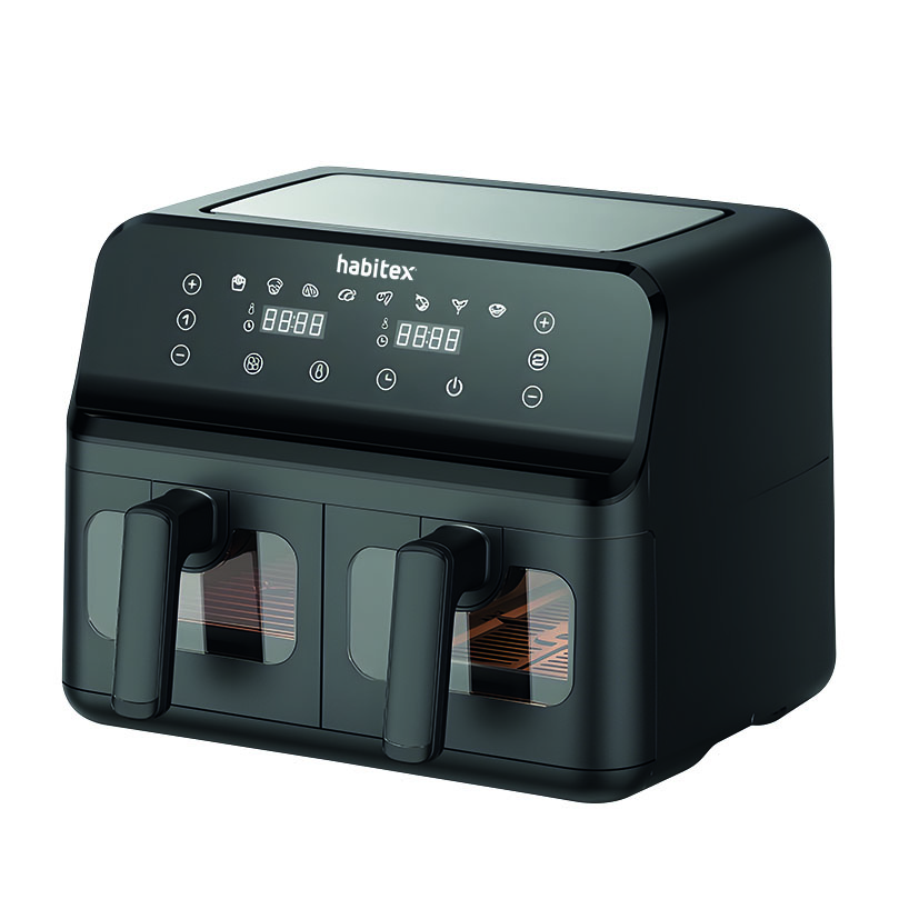 Freidora de aire doble HABITEX Air Fryer CC221D con control táctil digital, 8 menús preprogramados y ventanas de visualización. Ofrece cocción 360º sin aceite y con temperatura ajustable de 80 ºC a 200 ºC. Sus dos cavidades independientes (4,5 L + 4,5 L) permiten cocinar a la vez o por separado. Las bandejas extraíbles son fáciles de limpiar y aptas para lavavajillas. Con una potencia total de 2700 W y un diseño compacto de 39 x 39 x 30 cm, es ideal para cocinar más rápido y saludable.
