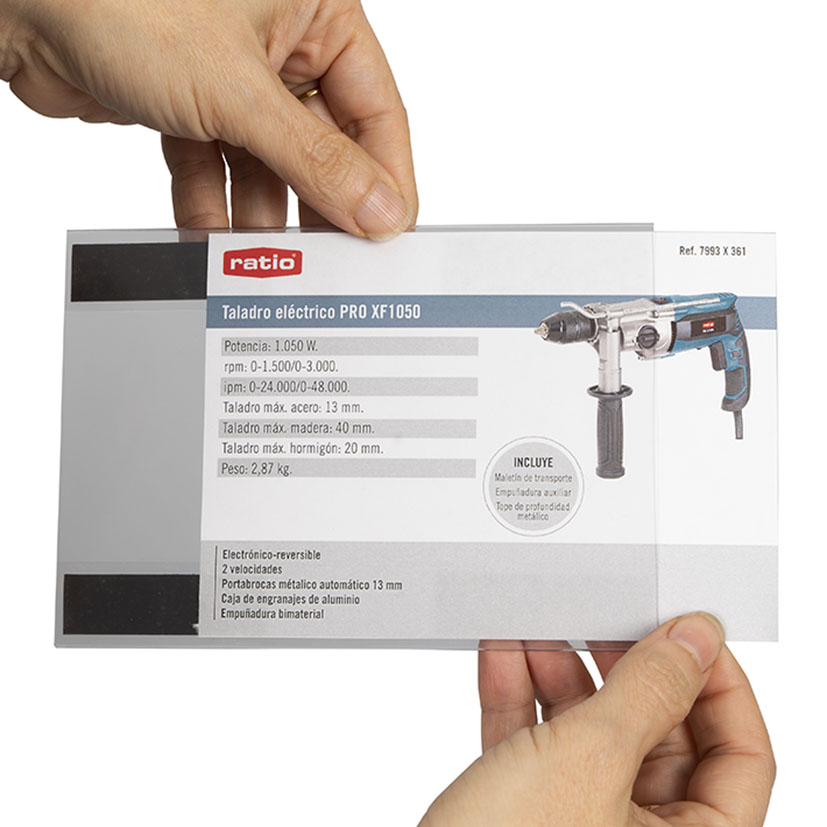 Indicada para mostrar fichas con características de productos (maquinaria de jardín, electroportátil, calzado, etc..). Encontrará estas fichas en nuestra intranet. Colocación horizontal. PVC transparente con trasera magnética para colocar sobre expositores metálicos, solapa para colocar en portaprecios de balda. Bolsas 10 unidades.