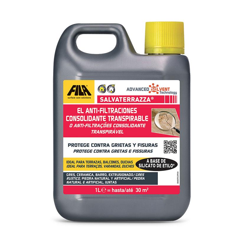 FILA Salvaterrazza es un tratamiento impermeabilizante diseñado para evitar filtraciones de agua a través de juntas, fisuras y grietas (hasta 1 mm). Penetra en profundidad protegiendo terrazas, balcones, cubiertas y azoteas sin alterar la transpirabilidad de las superficies.