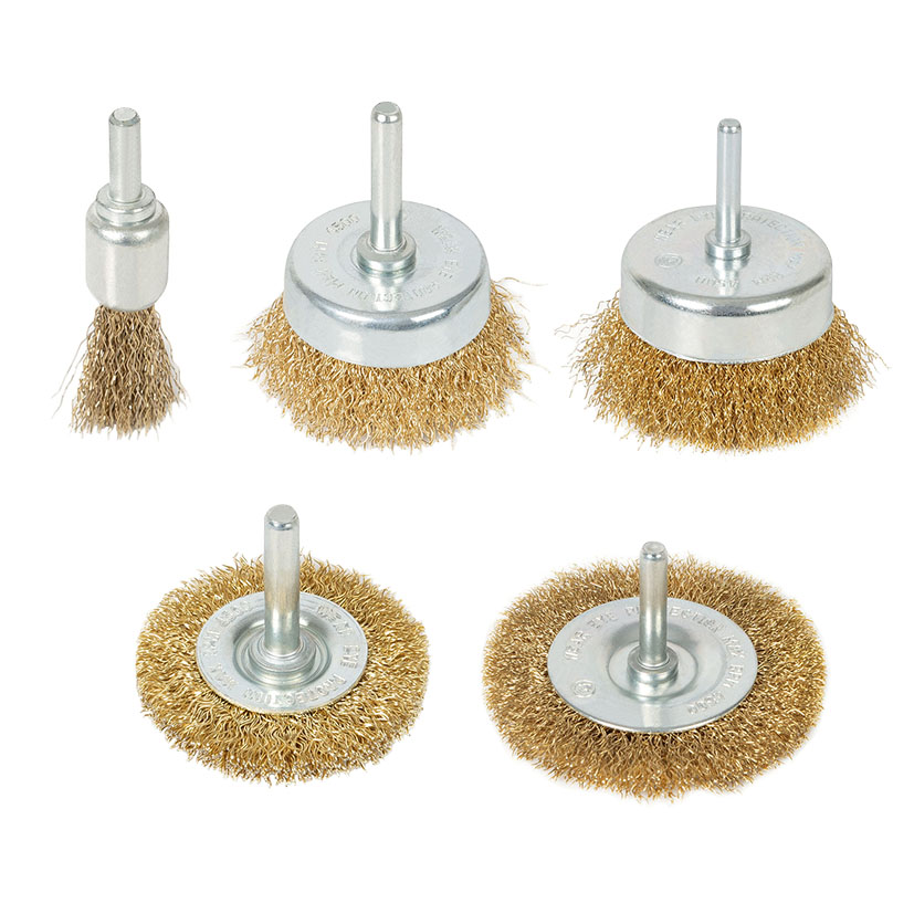 Este juego de 5 cepillos está fabricado en acero latonado ondulado, cuenta con púas de 0,30 mm e incluye vástago de 6 mm. El juego está formado por: