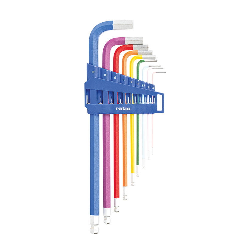 Este juego de llaves Allen está integrado por 9 piezas con punta de bola, varillas hexagonales de acero cromo-vanadio con recubrimiento de pintura electrostática de color para facilitar la diferenciación de las diferentes medidas. Incluye soporte de plástico para una buena ordenación y almacenaje de las mismas.