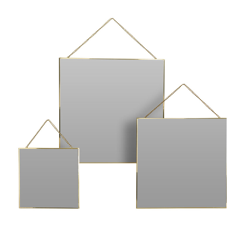 Este juego de 3 esepejos tiene un marco en metal dorado y están suspendidos con una cadena de metal dorada. Lo podrás colocar en el recibidor, baño, salón dormitorio, entre otros muchos lugares, gracias a su diseño minimalista. El espejo está compuesto por:
