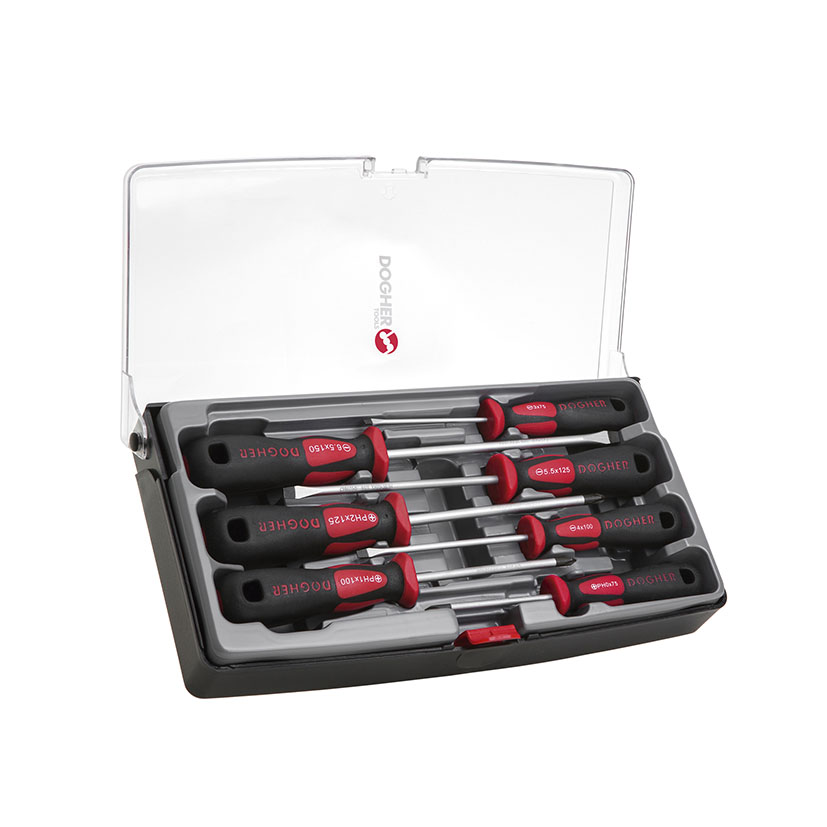 Juego de 7 destornilladores profesionales DOGHER Serie 330. Mango bidiametral con elastómero antideslizante en el 70% del cuerpo para un agarre seguro. Varillas fabricadas en cromo molibdeno con dureza 56 HRc y puntas protegidas frente a la oxidación.