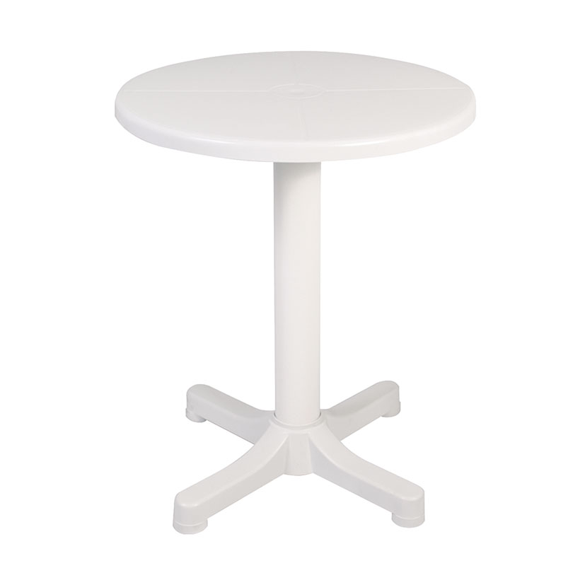Mesa balcónø 60 cm. Se sirve desmontada, y una vez montada es apilable. Resistente a los rayos UV. Pie de apoyo central. Ideal para balcón.