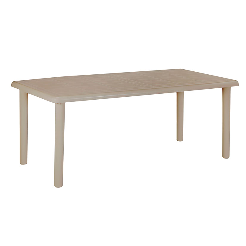 Mesa Olot140x90xh.73 cm. Mesa rectangular fabricada con polipropileno reciclado y reciclable. Agujero para parasol de ø 38 mm. Peso neto 7,5 kg.