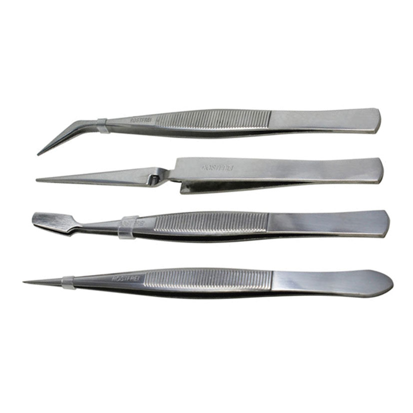 Están fabricadas en acero inoxidable y ofrecen diferentes puntas para adaptarse a las distintas tareas. El conjunto se presenta en una práctica bolsa-blíster de material plástico flexible y resistente, transparente en la parte anterior y opaco en la posterior, con compartimentos separados para cada pieza y solapa delantera con cierre automático. Las pinzas incluyen zona media de sujeción texturizada para evitar el deslizamiento de los dedos durante el trabajo. El kit incluye 4 pinzas con puntas: planas, curvas, redondeadas y cruzadas. Se presenta en una bolsa de 4 unidades.