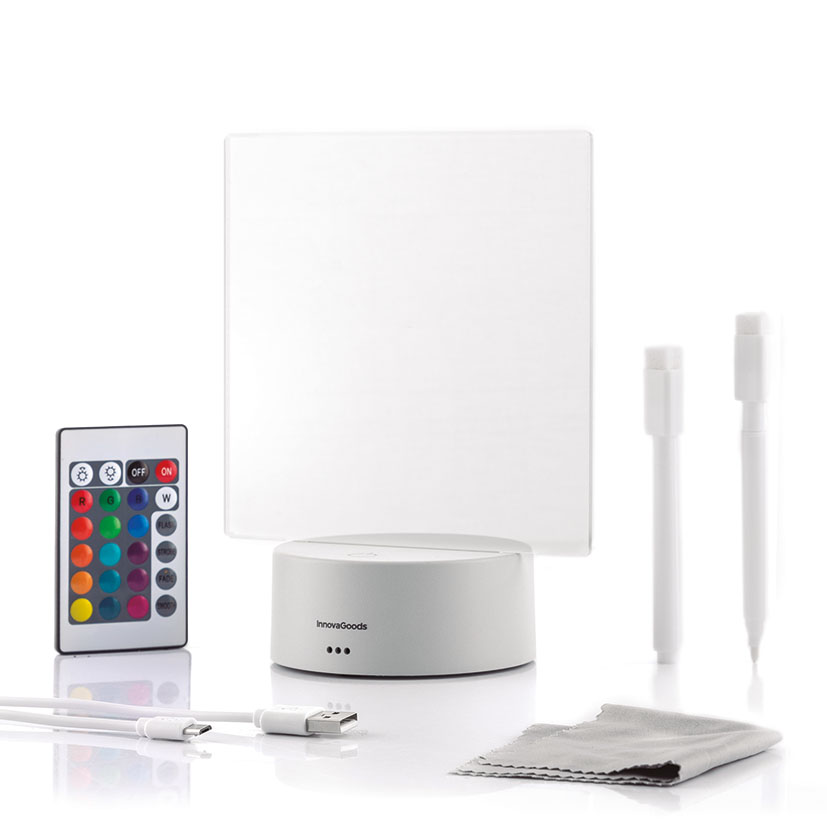 Esta pizarra o tablero de notas Led está indicada para personalizar las tareas de la semana o poner todo tipo de mensajes o anotaciones. Funciona con conexión USB o con pilas. Está compuesta por una base en polipropileno y un tablero acrílico transparente y resistente, la puedes colocar en cualquier lugar de tu hogar. Dispone de Led RGB multicolor con 16 colores, mando a distancia (pila incluida CR2023) y 5 modos modos de intensidad regulable. Se iluminan los bordes de la pantalla y todo lo que escribas o dibujes, por lo que creará una atmósfera muy especial. Lo podrás borrar facilmente. Incluye 2 rotuladores de tiza líquida blanca con esponja borradora, cable USB. También es un motivo de regalo tanto para adultos como para niños. Puedes ver el video que tenemos colgado en nuestra web para completar la información del producto. Viene presentada en una caja y tiene 3 años de garantía.