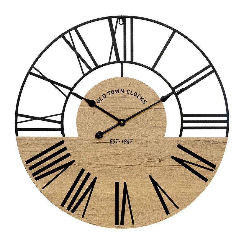 Este reloj es analógico, tiene un diámetro de 70 cm y está fabricado en metal de color negro combinado con madera MDF en color natural. Las manetas del reloj son de color negro y los números son romanos. Tiene un diseño decorativo que no pasará desapercibido allá donde lo coloques. Funciona con una pila de tipo AA LR06 que no está incluida.