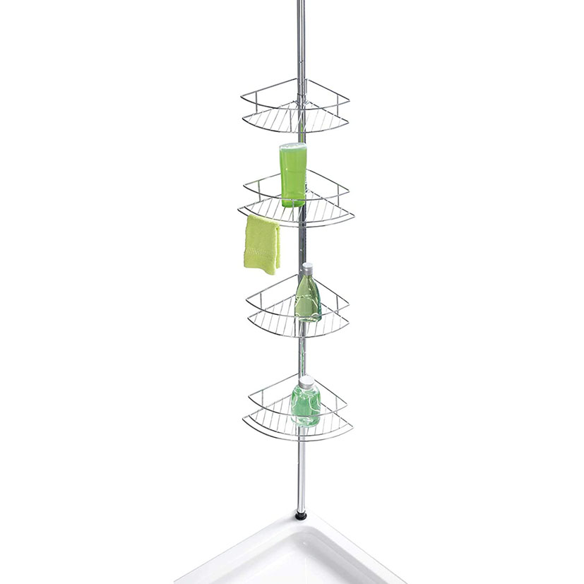 Este estante para esquina se adapta sin dificultad a cualquier ducha o baño. Está construido con acero inoxidable y cuenta con dos cestas de alambre para almacenar productos, además de dos cestas adicionales para colgar paños y una barra telescópica ajustable. Sus medidas son 31x23x65/275 cm.
