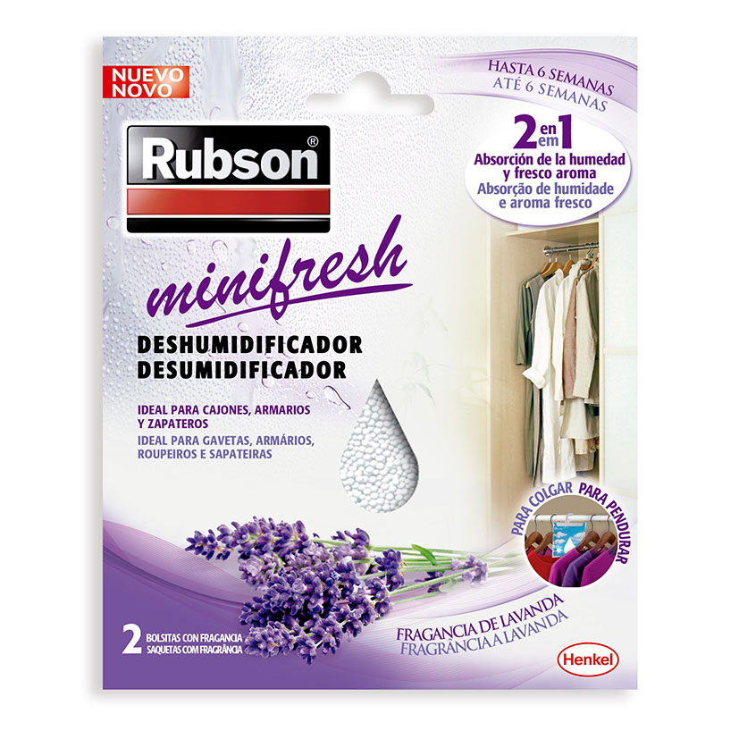 «Rubson Minifresh es un deshumidificador y ambientador con aroma lavanda en formato percha, ideal para colgar o colocar en armarios, vestidores, cajones o zapateros, ya que aparte de su cómodo formato, no aporta riesgo de fuga.