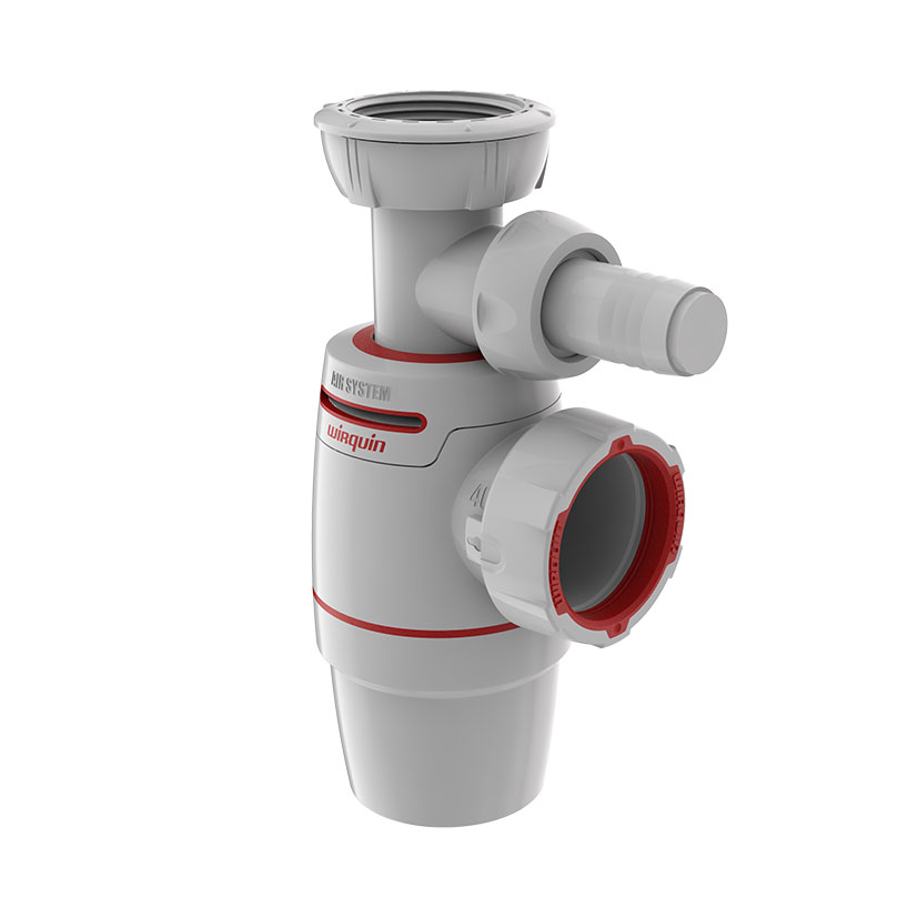 Salida horizontal. Función air system que permite una ventilación constante del sifón y evita los ruidos y olores. Juntas moldeadas para una estanqueidad total. Instalación rápida mediante tuerca 1/4 de vuelta unida al sifón.