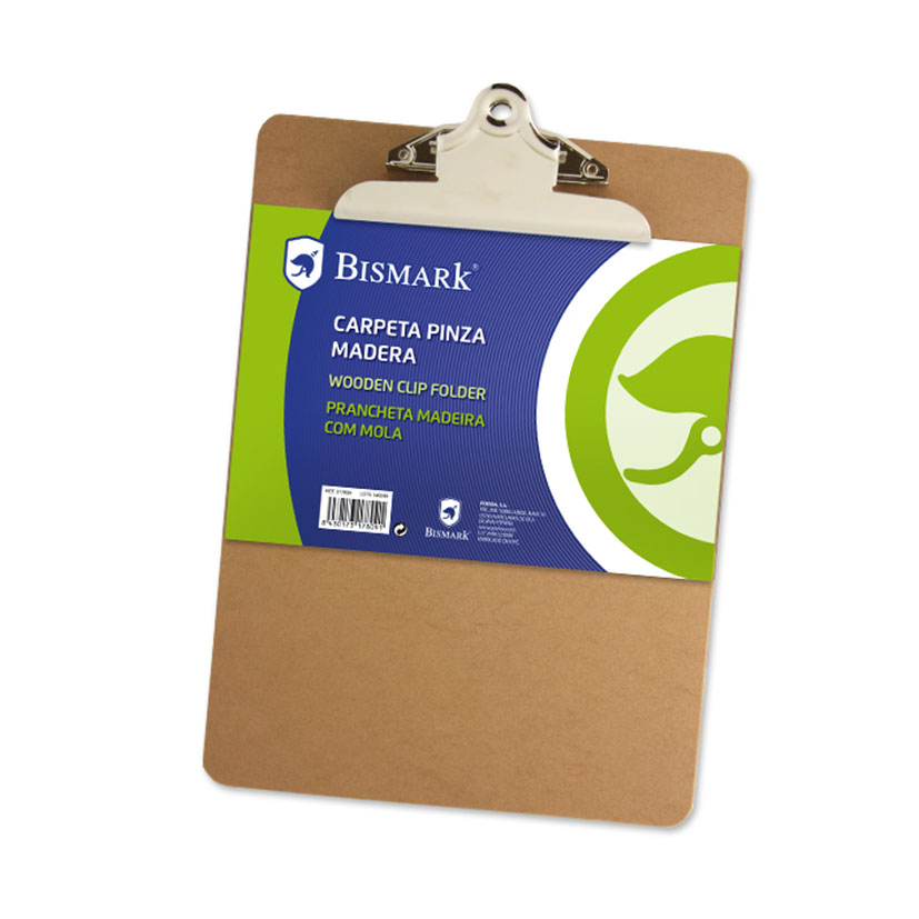 Esta carpeta tiene una base de madera con una pinza metálica y de tamaño folio.