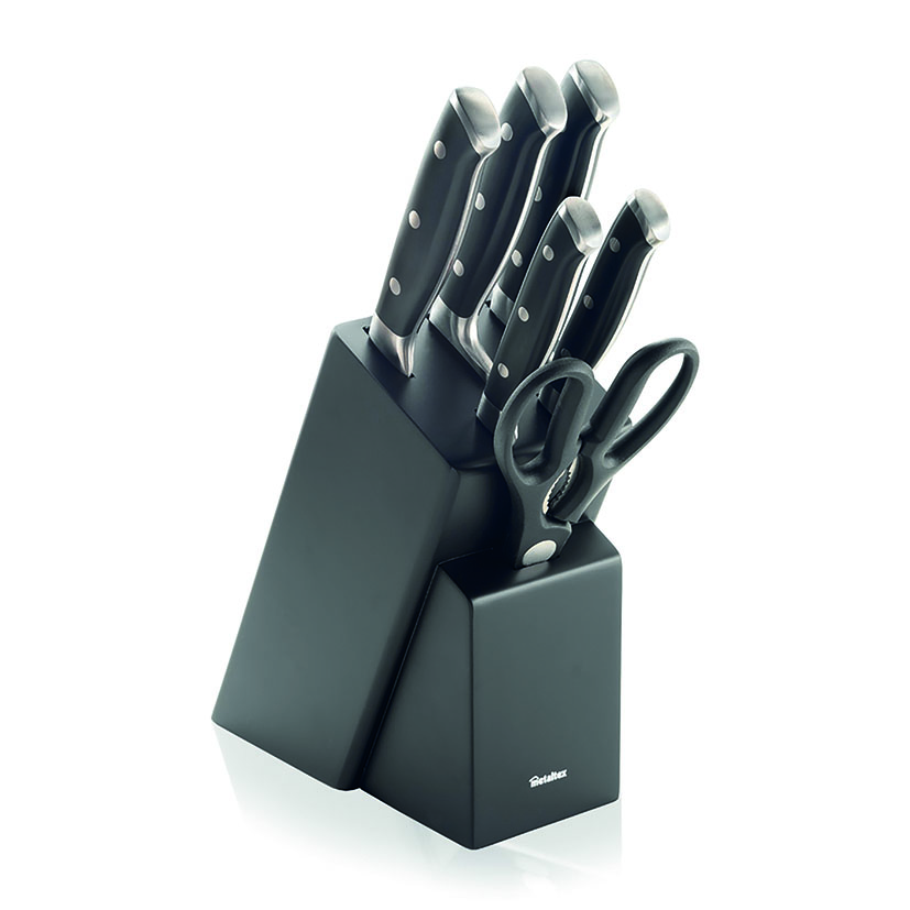 El Tacoma METALTEX es un set completo para tu cocina, compuesto por 4 cuchillos de alta calidad (chef, Santoku, pan, multiuso y pelador) y una tijera multiuso, todos ellos con hoja de acero inoxidable al molibdeno fabricada en una sola pieza de 2,4 mm de grosor. Su afilado cónico rectificado en ambos lados asegura cortes limpios y precisos, mientras que la dureza HRC 57 proporciona una larga vida útil y resistencia al desgaste. El diseño se completa con un tope de metal acabado mate y un elegante tacoma de madera, que aporta orden y estilo a la cocina. El conjunto se presenta en caja, perfecto también como regalo.