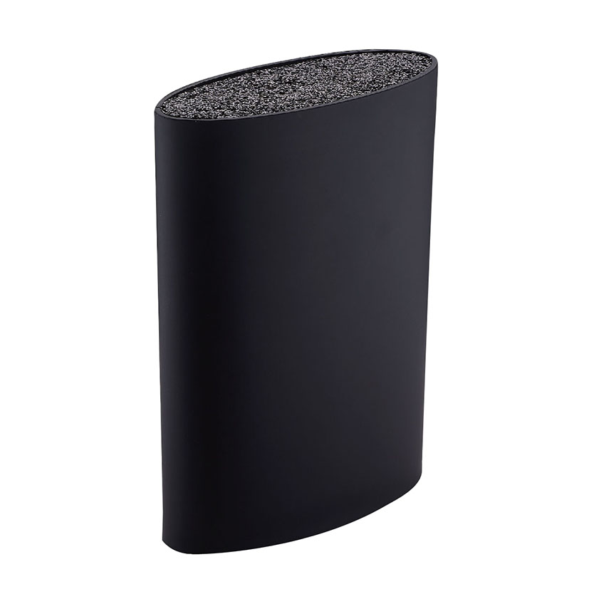 Fabricado en polipropileno de color negro. Tiene una forma ovalada y su interior está compuesto por filamentos plásticos para proteger y sujetar el filo de los cuchillos de hasta 20 cm de hoja. Además podrás extraer la carcasa de taco suave Soft Touch exterior y limpiar los filamentos bajo el grifo. Viene presentado en una caja.