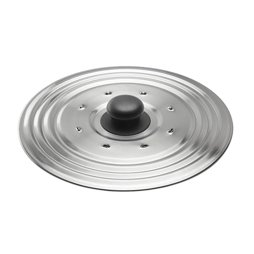 Tapa multiusos INOXIBARAcero inox de gran robustez. Con agujeros para salida vapor. Adaptables a varias medidas. Pomo de baquelita aislante del calor..