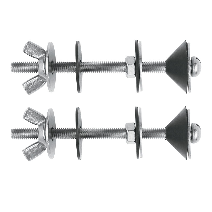 Este juego de dos tornillos en acero inoxidable se presenta en una bolsa con 2 tornillos, juntas y tuercas.