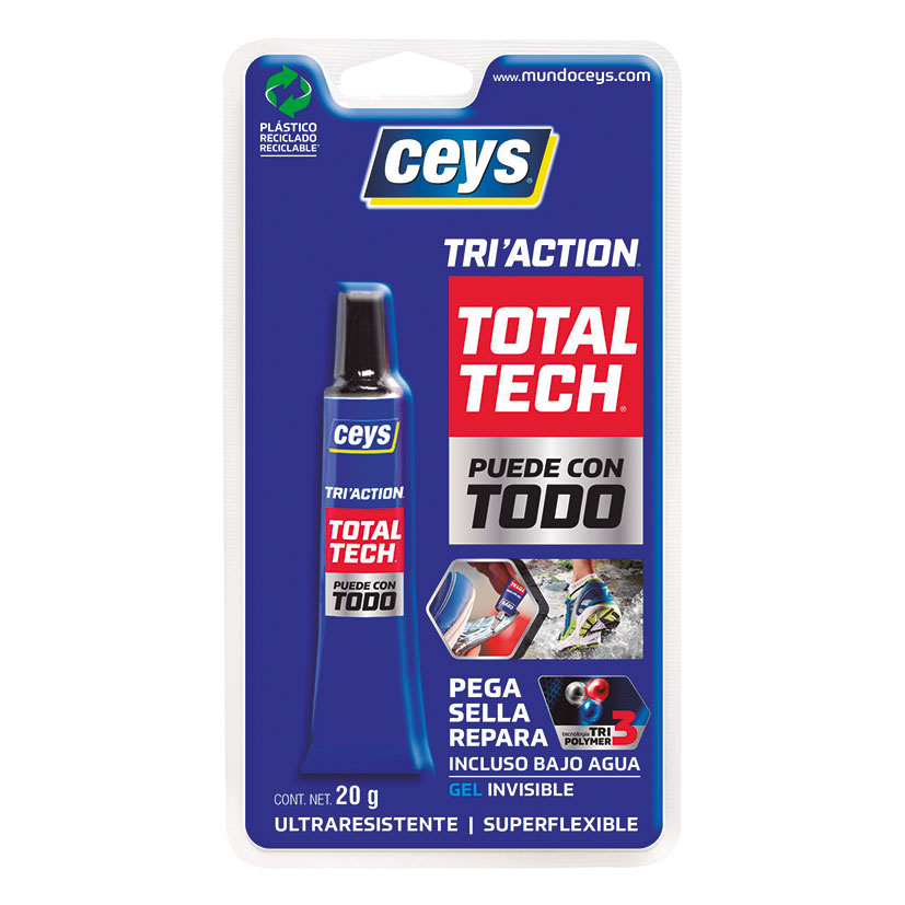Sellador CEYS Total-Tech TriactionPega repara y sella. Resiste agua, golpes y temperaturas extremas. Interior-exterior. Translúcido.