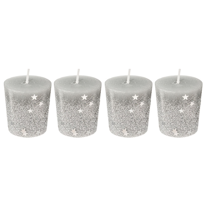 Juego 4 velas decoradas 4,5 cmø 4xh.4,5 cm. Pack 4 unid. Duración 7 horas.